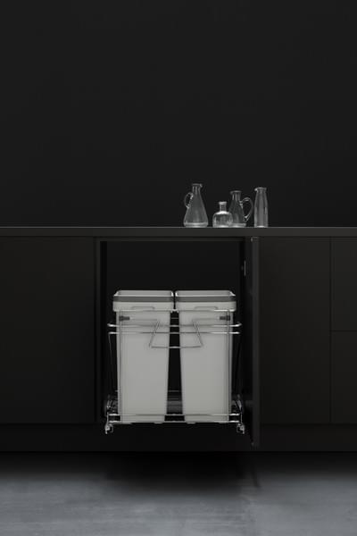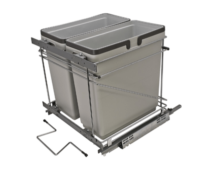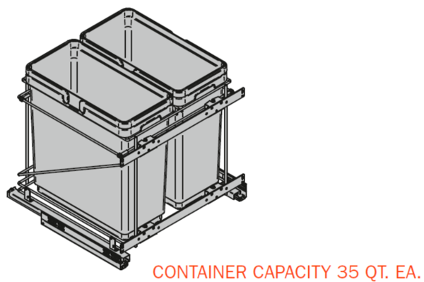 21” Salice Base pull-out waste bins. Soft close, wire bottom, full extension (500mm). Handle and door brackets included. Two 35 Qt. plastic bin. The waste bins are equipped with handles to easily keep your trash bag inside and lift cans up. Bottom mount.