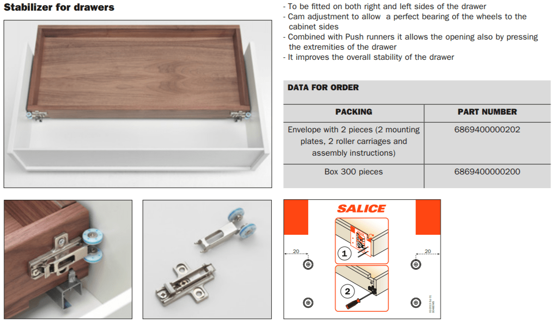 This stabilizer kit improves the overall stability of wider than normal pullouts or drawers. It also allows for the ability to press on the extremities of the drawer front to activate the push to open features when these drawer runners are used. The stabilisers feature cam adjustment to ensure a prefect alignment with the side of the cabinet. The kit includes two stabilisers, one for either side of the pullouts or drawers.