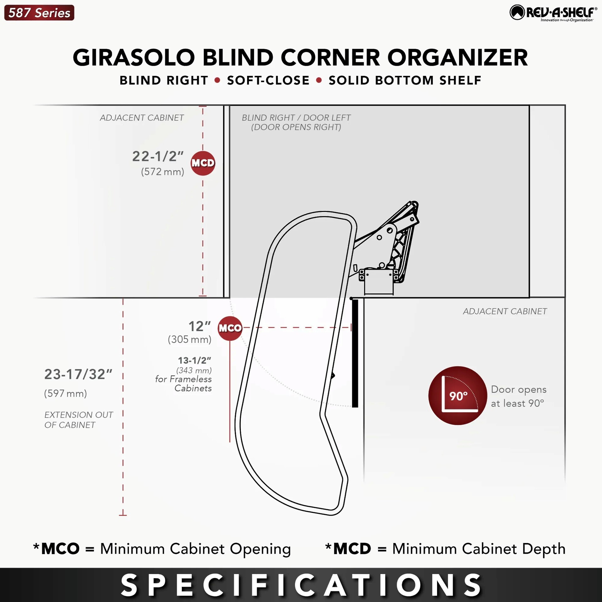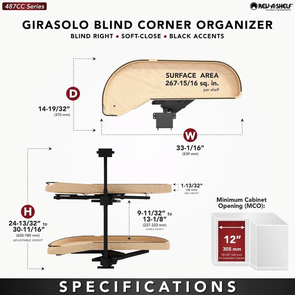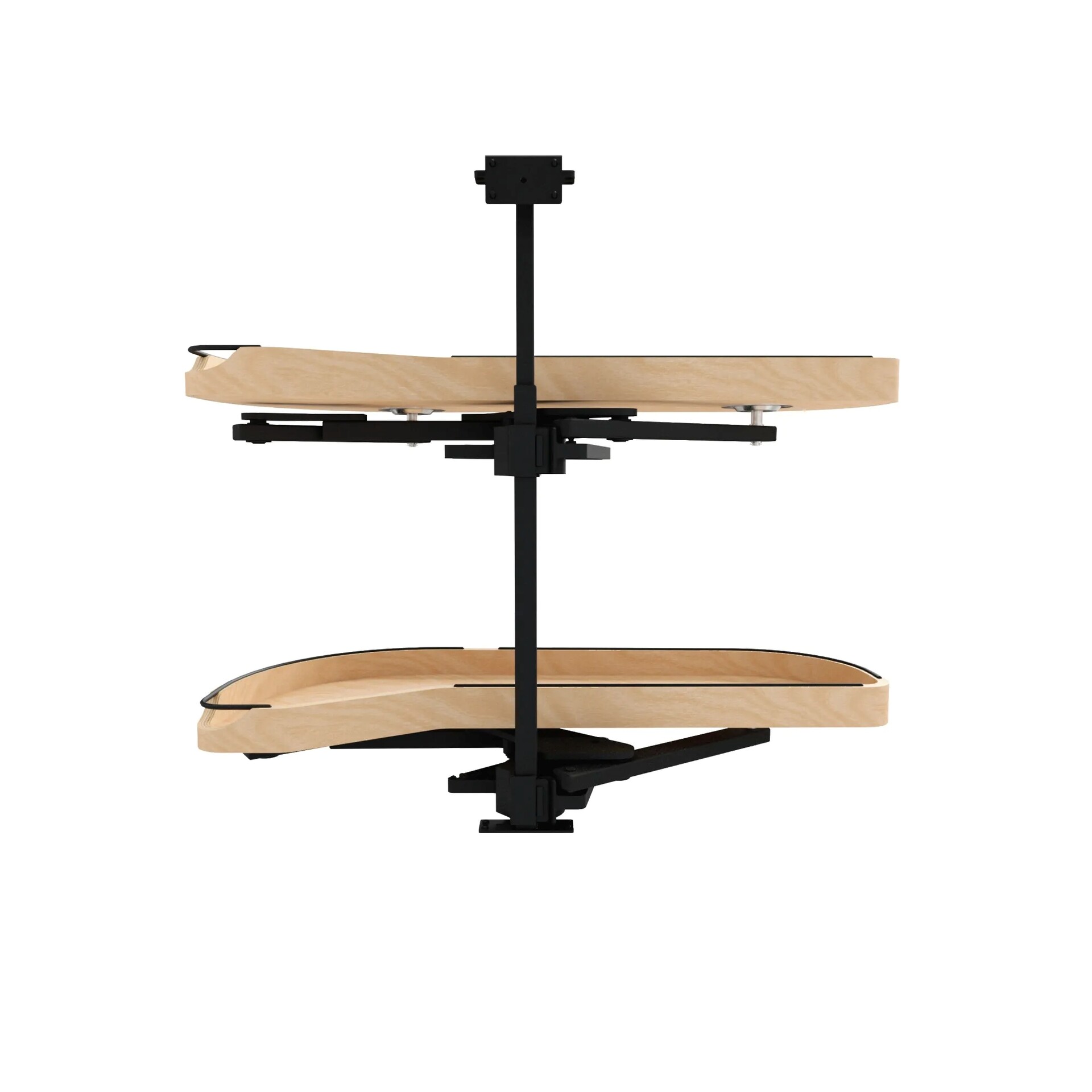 The 487CC Series Craftsman Collection "Girasolo" Blind Corner Optimizer by Rev-A-Shelf® offers a refined and sophisticated update to the classic Girasolo design. Crafted from maple with gracefully curved lines and soft edges, this innovative solution blends both elegance and practicality. The Girasolo glides effortlessly out of the cabinet on a soft-close pivot hardware system, eliminating the need for adjacent appliance clearance and maximizing accessibility. Designed for both right and left blind corner cabinet openings, it is available in multiple sizes and single or two-tier configurations, providing versatile storage options for hard-to-reach spaces.