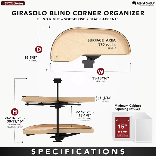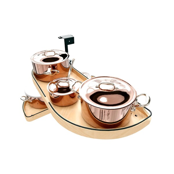 The 487CC Series Craftsman Collection "Girasolo" Blind Corner Optimizer by Rev-A-Shelf® offers a refined and sophisticated update to the classic Girasolo design. Crafted from maple with gracefully curved lines and soft edges, this innovative solution blends both elegance and practicality. The Girasolo glides effortlessly out of the cabinet on a soft-close pivot hardware system, eliminating the need for adjacent appliance clearance and maximizing accessibility. Designed for both right and left blind corner cabinet openings, it is available in multiple sizes and single or two-tier configurations, providing versatile storage options for hard-to-reach spaces.