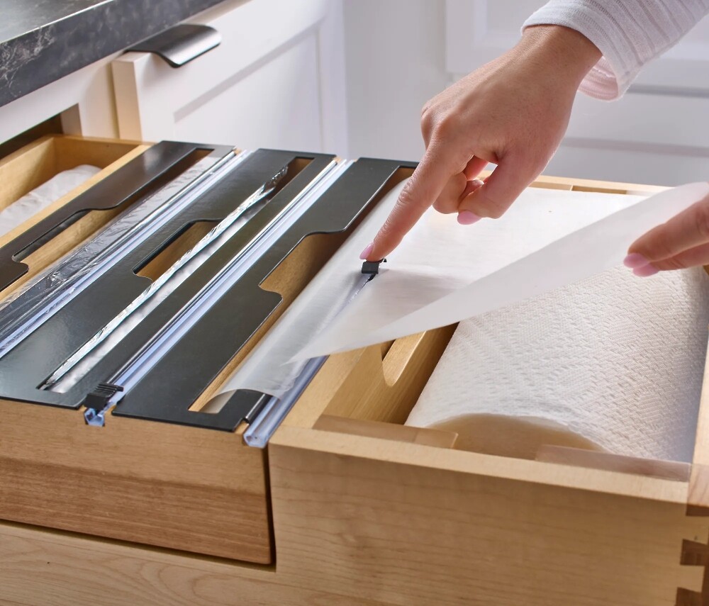 Wood Base Cabinet Paper Towel Tiered Drawer System w/ Foil Cutters and BLUM Soft-Close